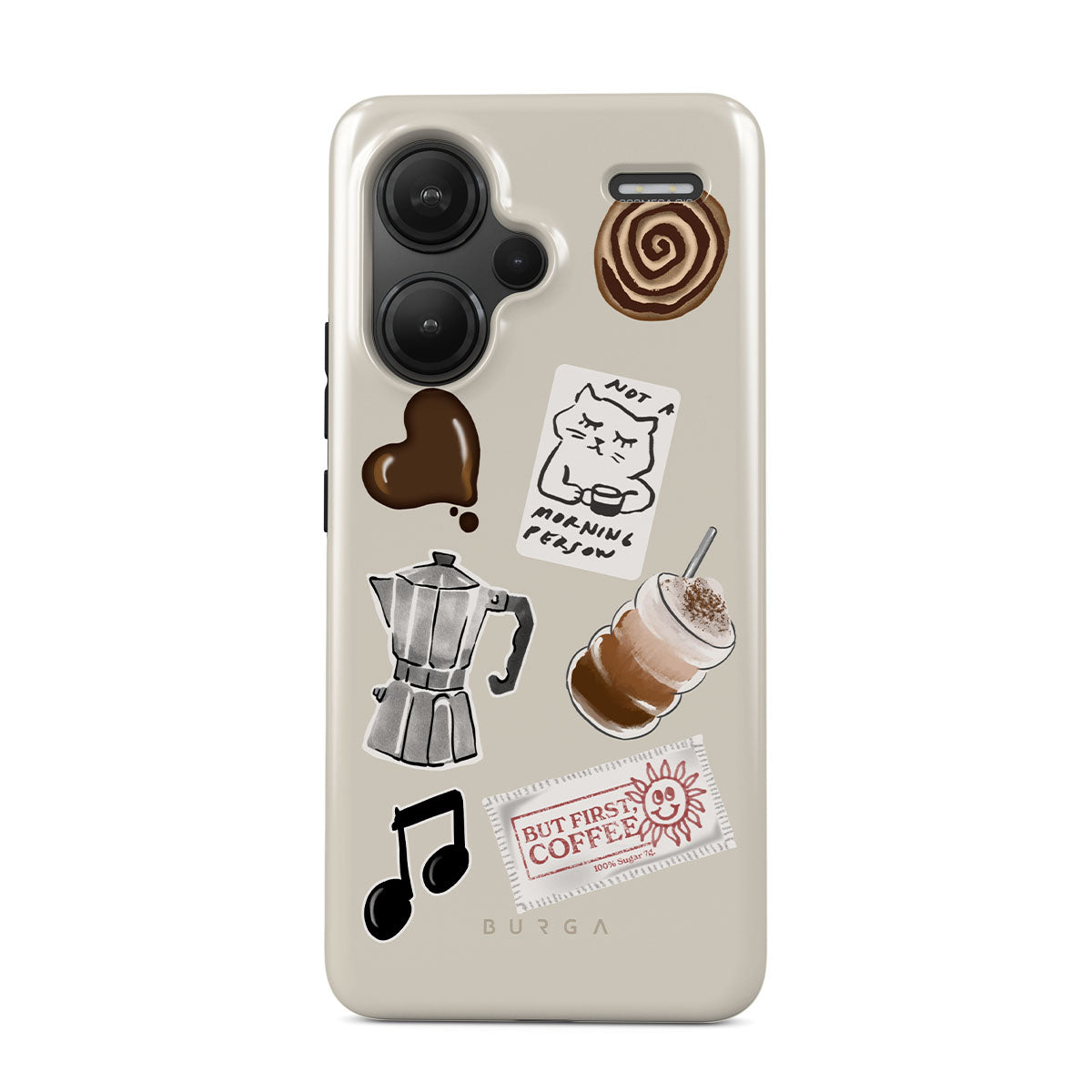 En este diseño: cafetera moka, frappé, rollo de canela, corazón de chocolate, sticker "Not a morning person", ticket "But First, Coffee", nota musical.