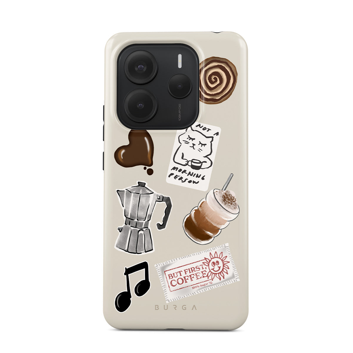 En este diseño: cafetera moka, frappé, rollo de canela, corazón de chocolate, sticker "Not a morning person", ticket "But First, Coffee", nota musical.