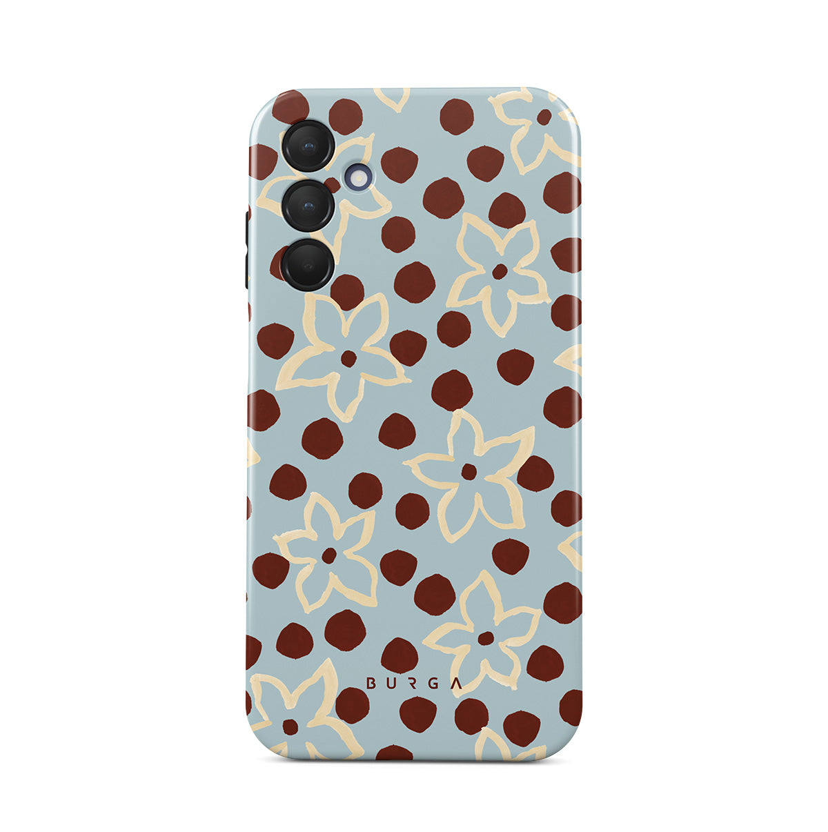 En este diseño: flores, patrón de puntos, fondo azul claro