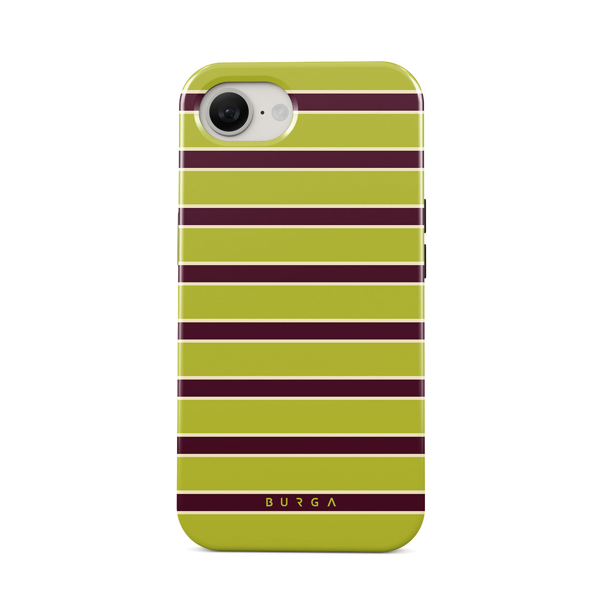 En este diseño: franjas horizontales gruesas en verde lima y burdeos.