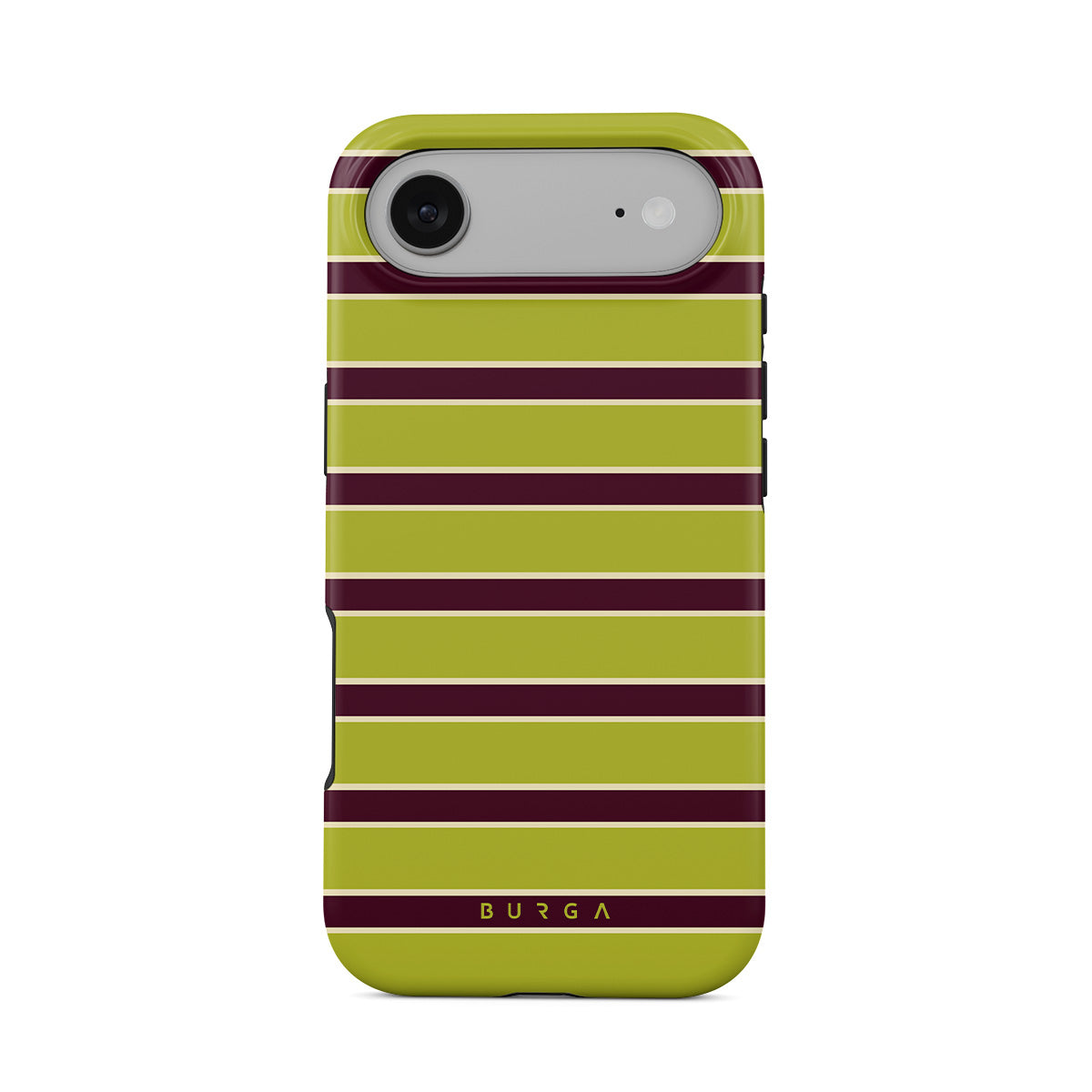En este diseño: franjas horizontales gruesas en verde lima y burdeos.
