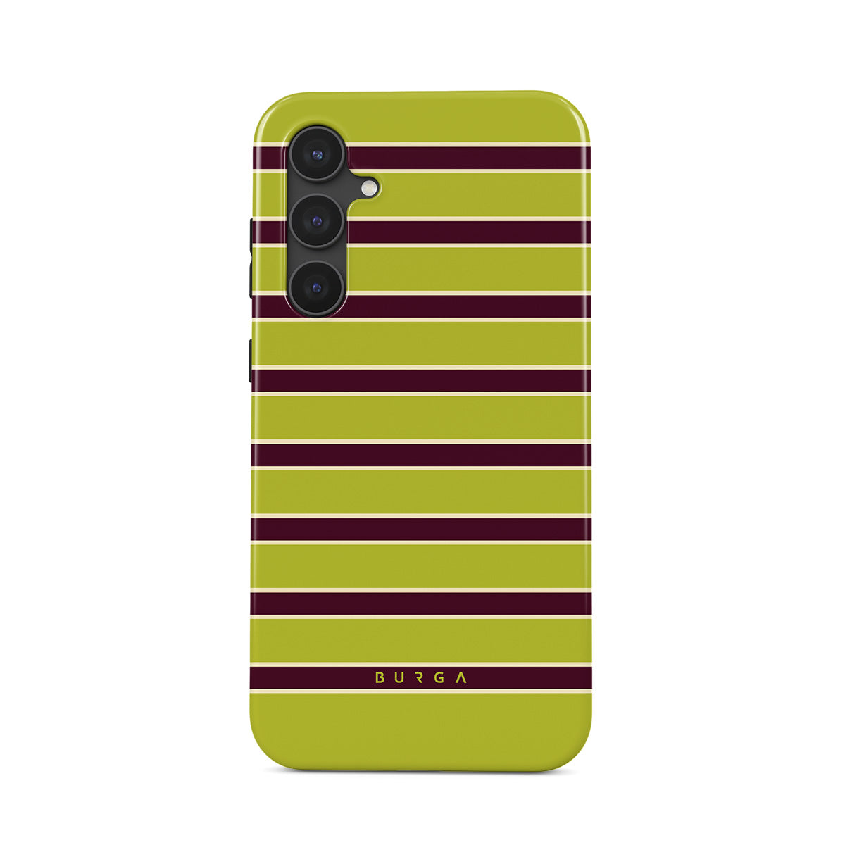 En este diseño: franjas horizontales gruesas en verde lima y burdeos.