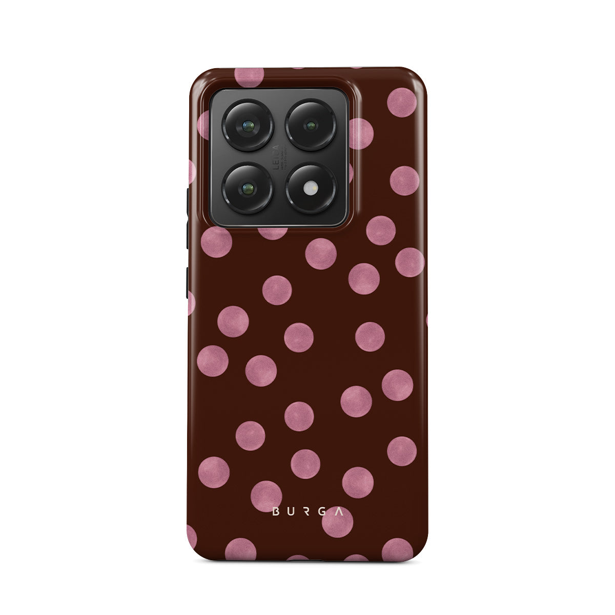 Características de este diseño: lunares rosas, fondo café, estampado de puntos