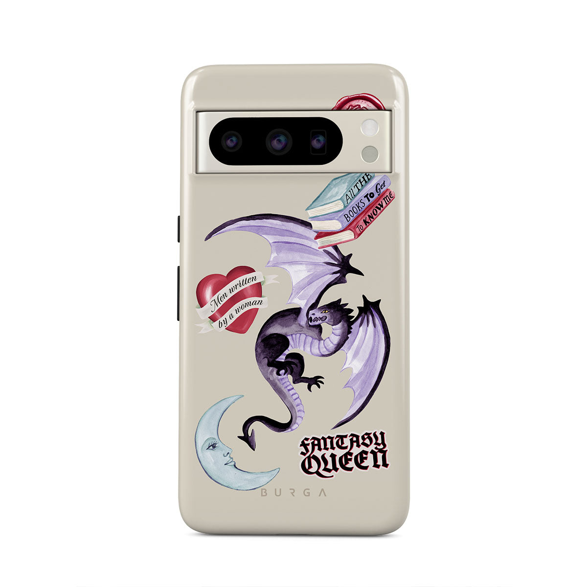 En este diseño: dragón morado, sticker "Fantasy Queen", luna creciente, sello de cera morado, corazón con mensaje, libros.
