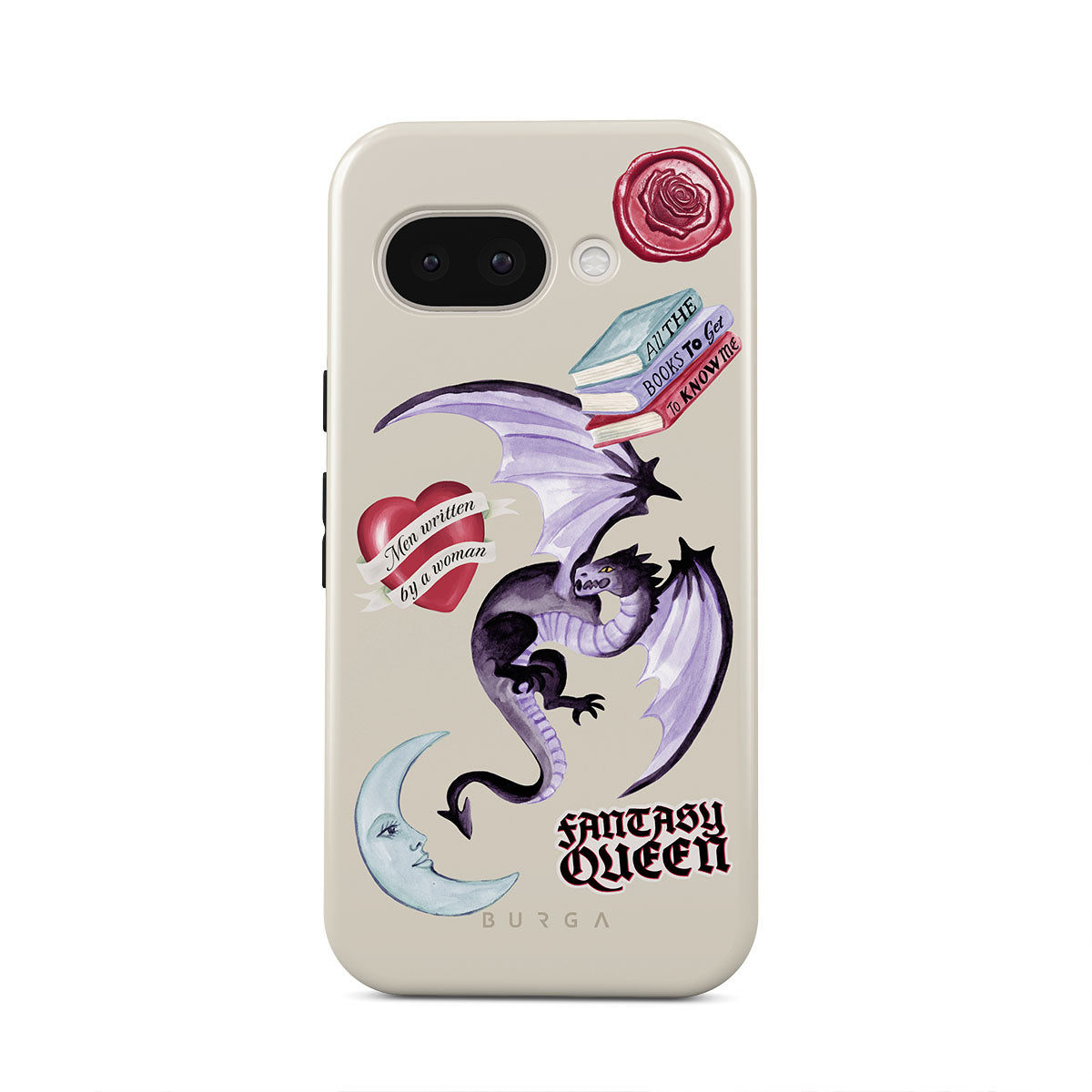 En este diseño: dragón morado, sticker "Fantasy Queen", luna creciente, sello de cera morado, corazón con mensaje, libros.