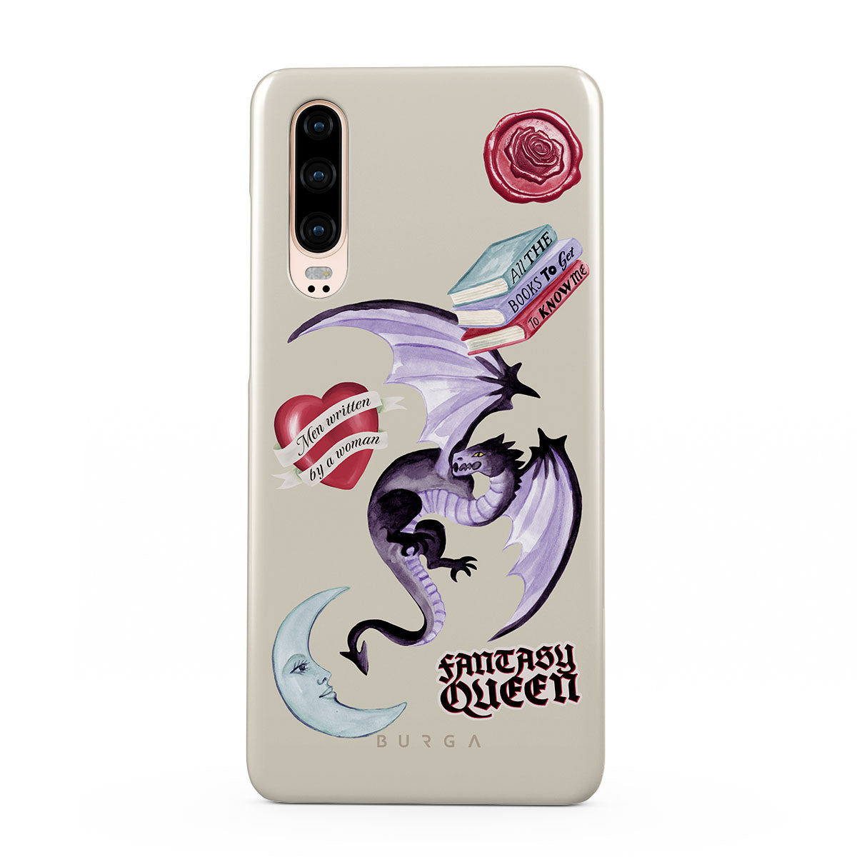 En este diseño: dragón morado, sticker "Fantasy Queen", luna creciente, sello de cera morado, corazón con mensaje, libros.