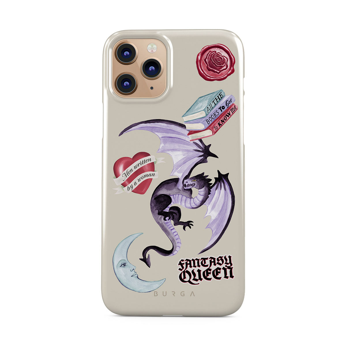 En este diseño: dragón morado, sticker "Fantasy Queen", luna creciente, sello de cera morado, corazón con mensaje, libros.