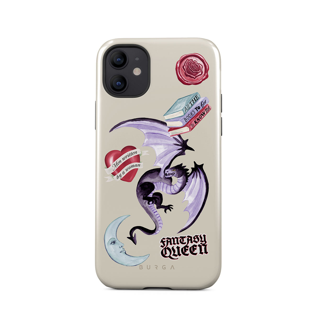 En este diseño: dragón morado, sticker "Fantasy Queen", luna creciente, sello de cera morado, corazón con mensaje, libros.
