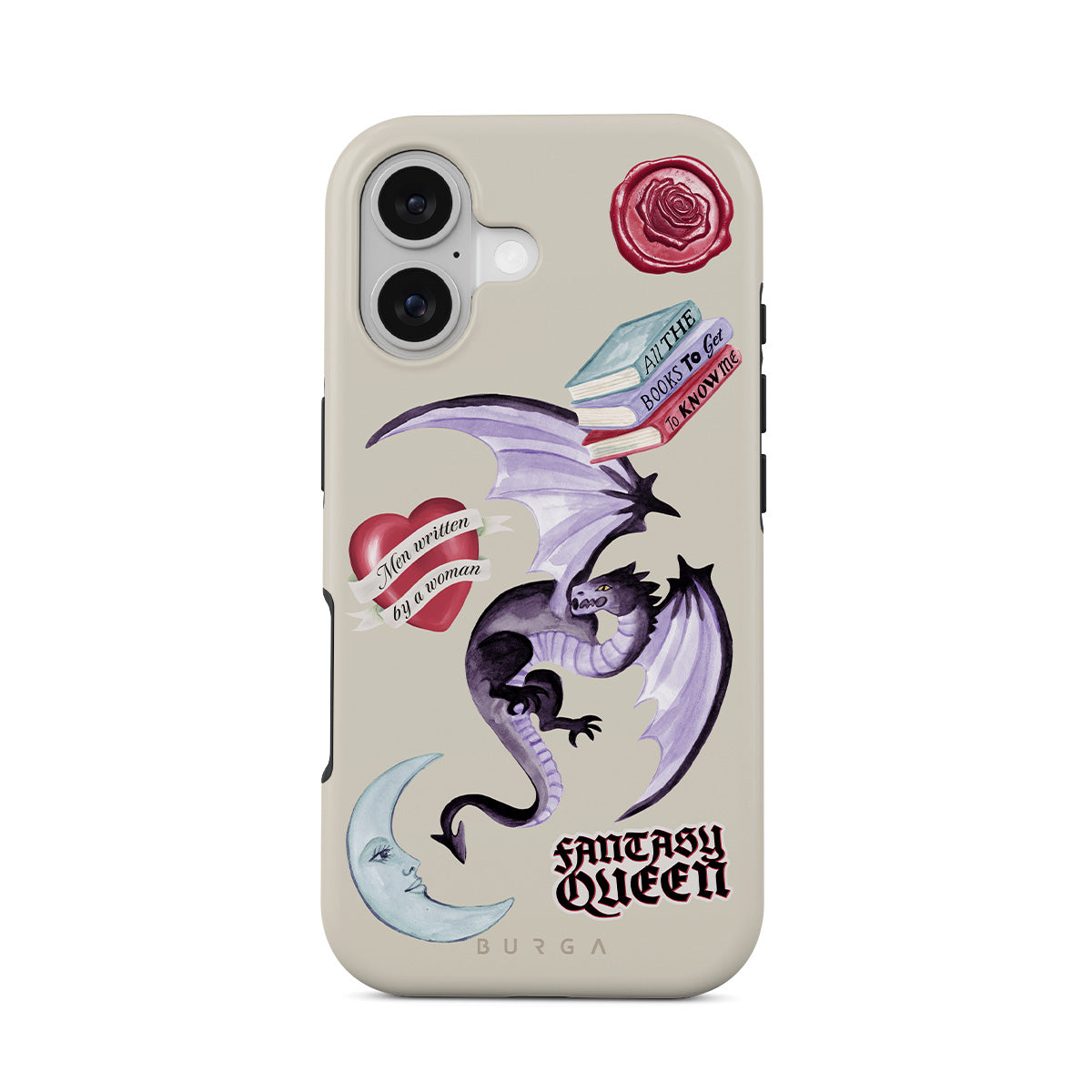 En este diseño: dragón morado, sticker "Fantasy Queen", luna creciente, sello de cera morado, corazón con mensaje, libros.