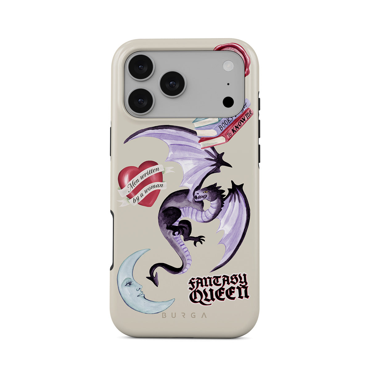 En este diseño: dragón morado, sticker "Fantasy Queen", luna creciente, sello de cera morado, corazón con mensaje, libros.
