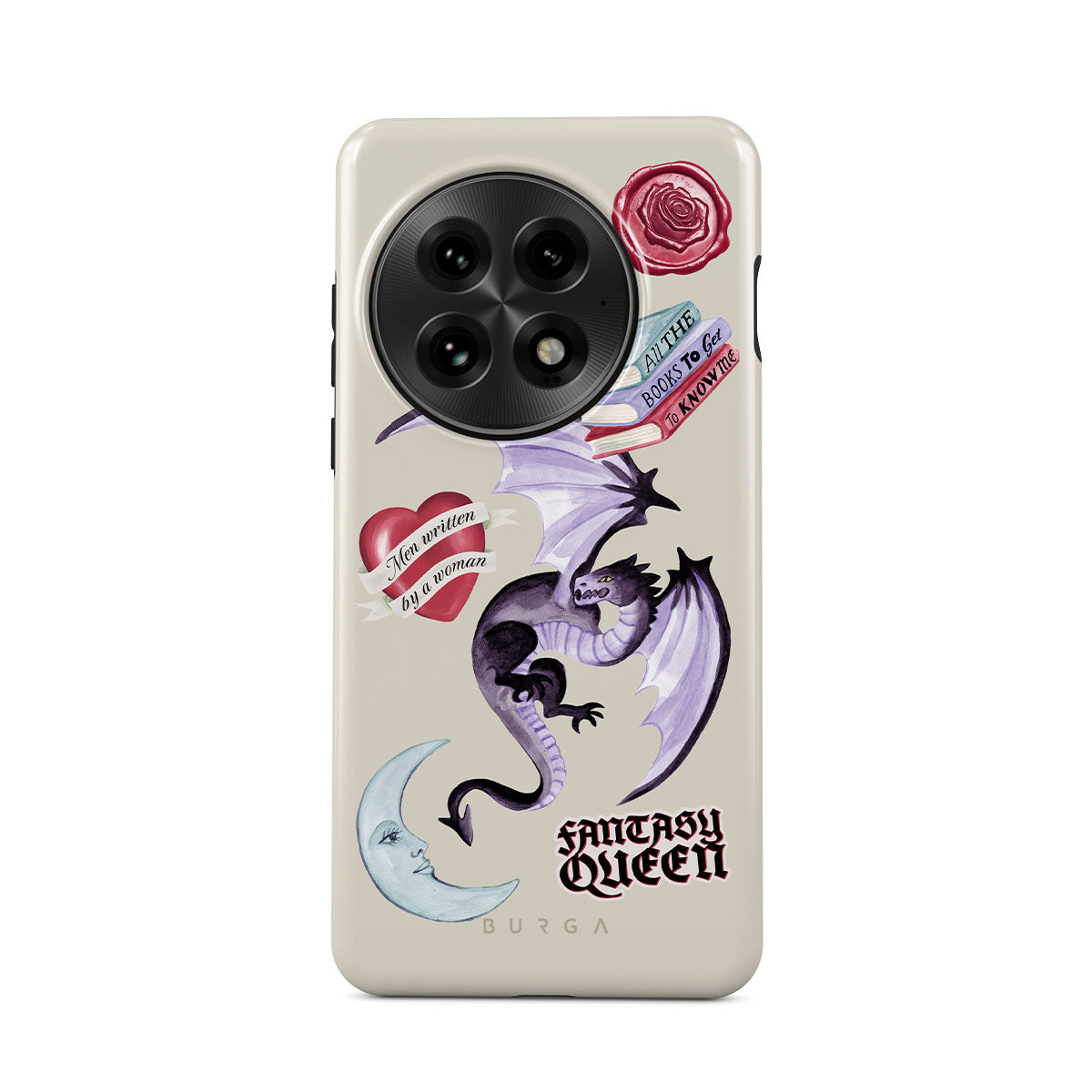 En este diseño: dragón morado, sticker "Fantasy Queen", luna creciente, sello de cera morado, corazón con mensaje, libros.