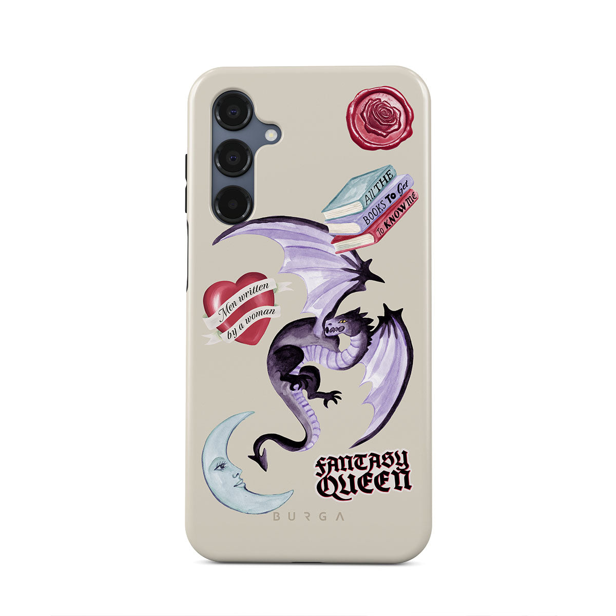 En este diseño: dragón morado, sticker "Fantasy Queen", luna creciente, sello de cera morado, corazón con mensaje, libros.
