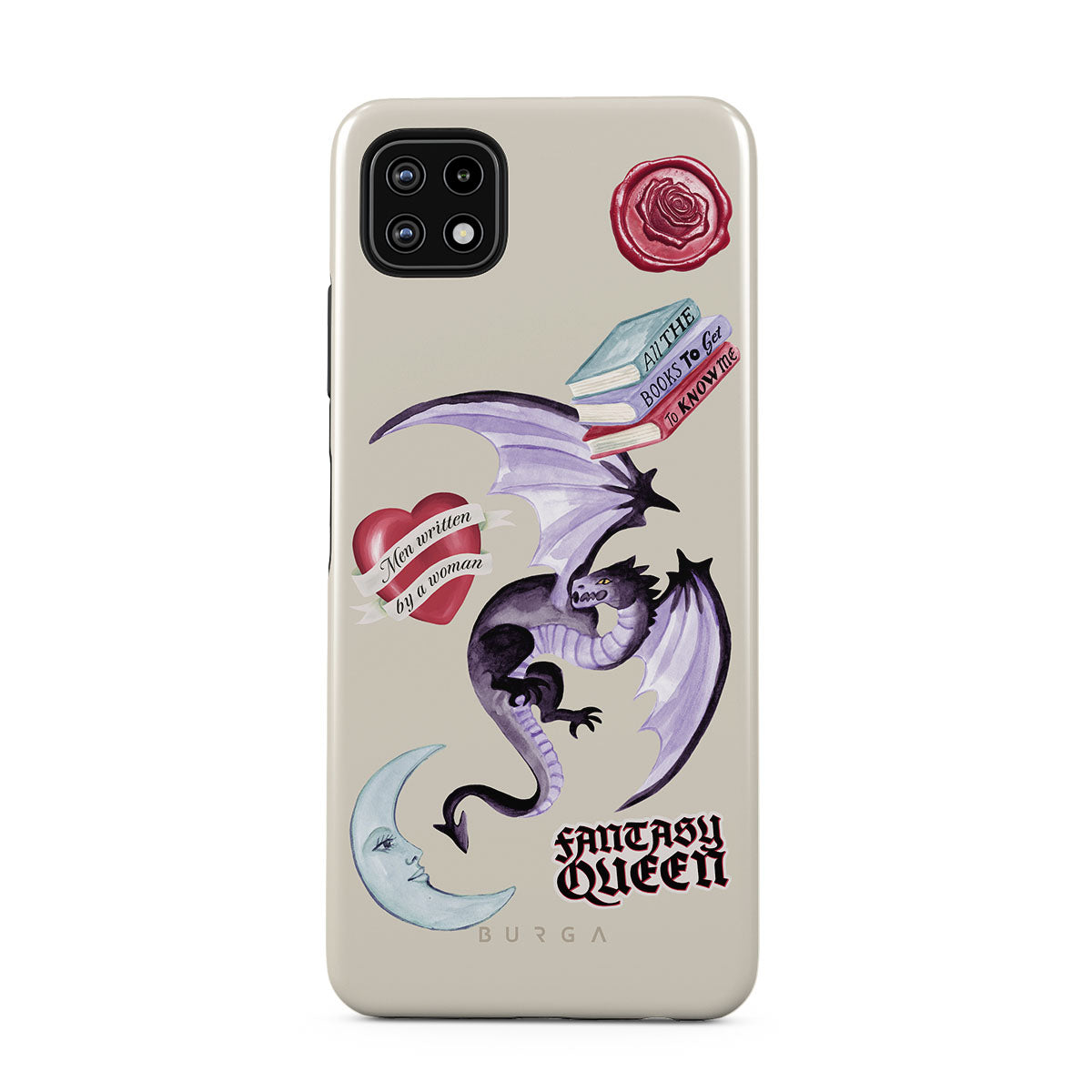 En este diseño: dragón morado, sticker "Fantasy Queen", luna creciente, sello de cera morado, corazón con mensaje, libros.