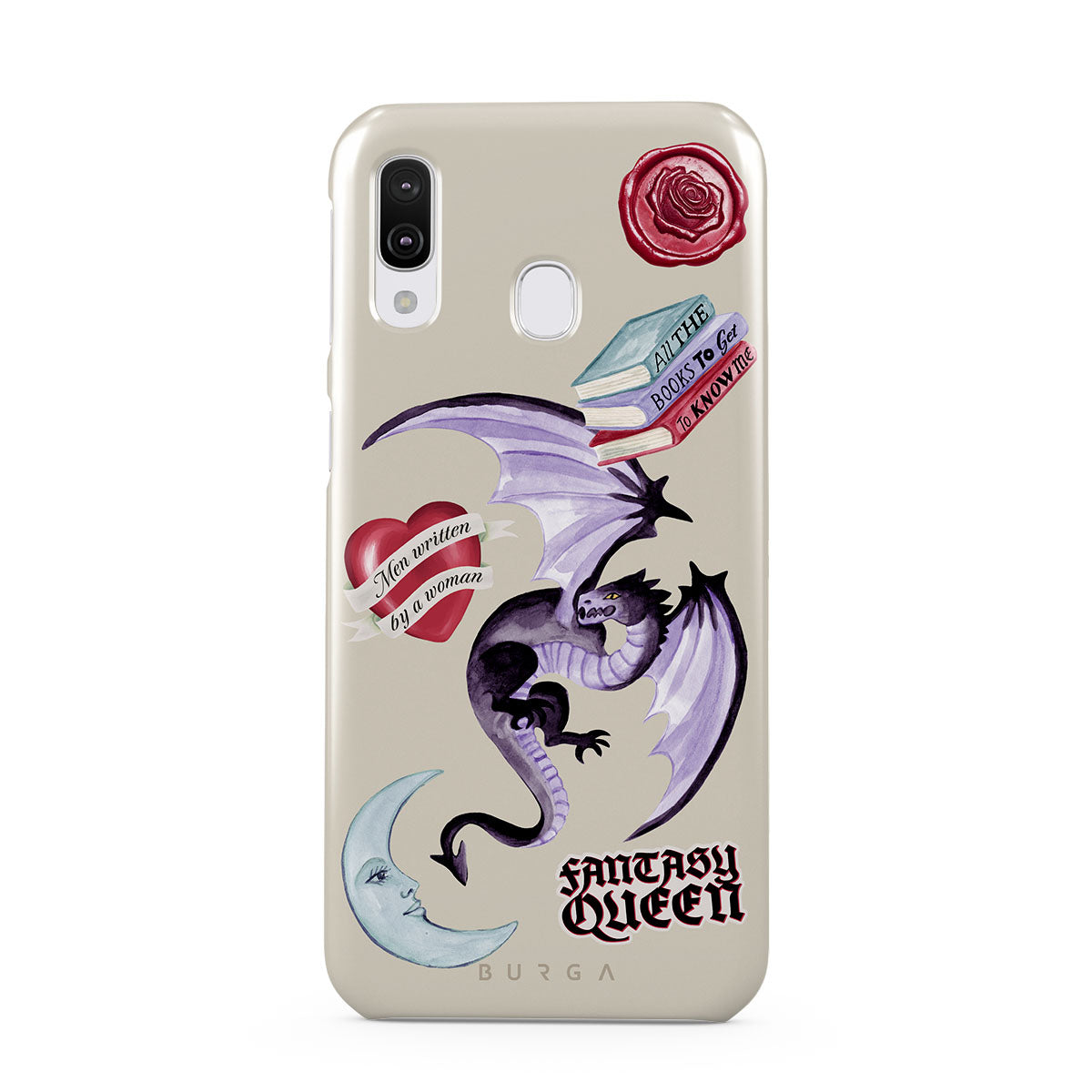En este diseño: dragón morado, sticker "Fantasy Queen", luna creciente, sello de cera morado, corazón con mensaje, libros.
