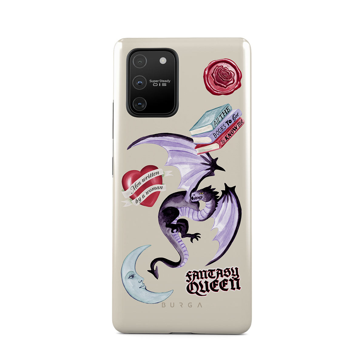 En este diseño: dragón morado, sticker "Fantasy Queen", luna creciente, sello de cera morado, corazón con mensaje, libros.