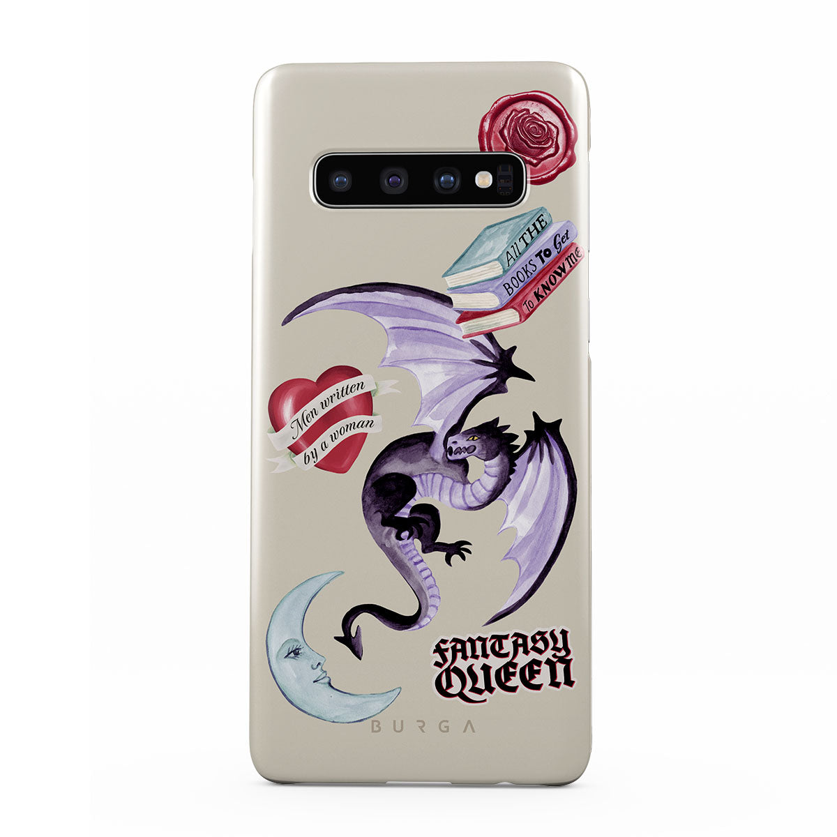 En este diseño: dragón morado, sticker "Fantasy Queen", luna creciente, sello de cera morado, corazón con mensaje, libros.