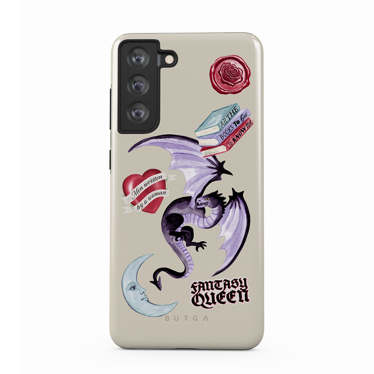 En este diseño: dragón morado, sticker "Fantasy Queen", luna creciente, sello de cera morado, corazón con mensaje, libros.