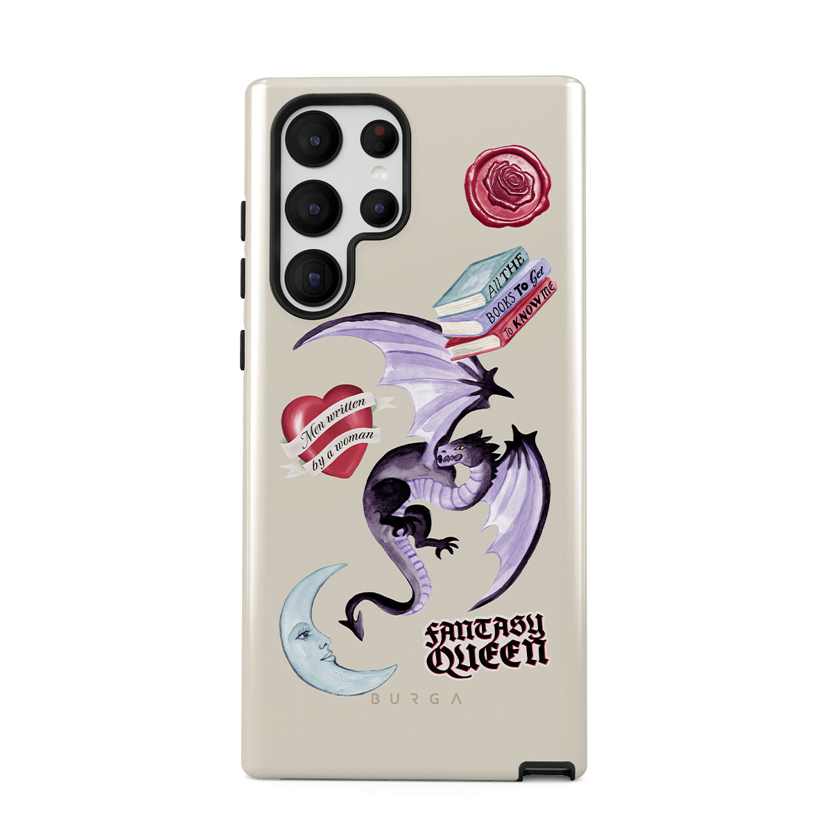 En este diseño: dragón morado, sticker "Fantasy Queen", luna creciente, sello de cera morado, corazón con mensaje, libros.