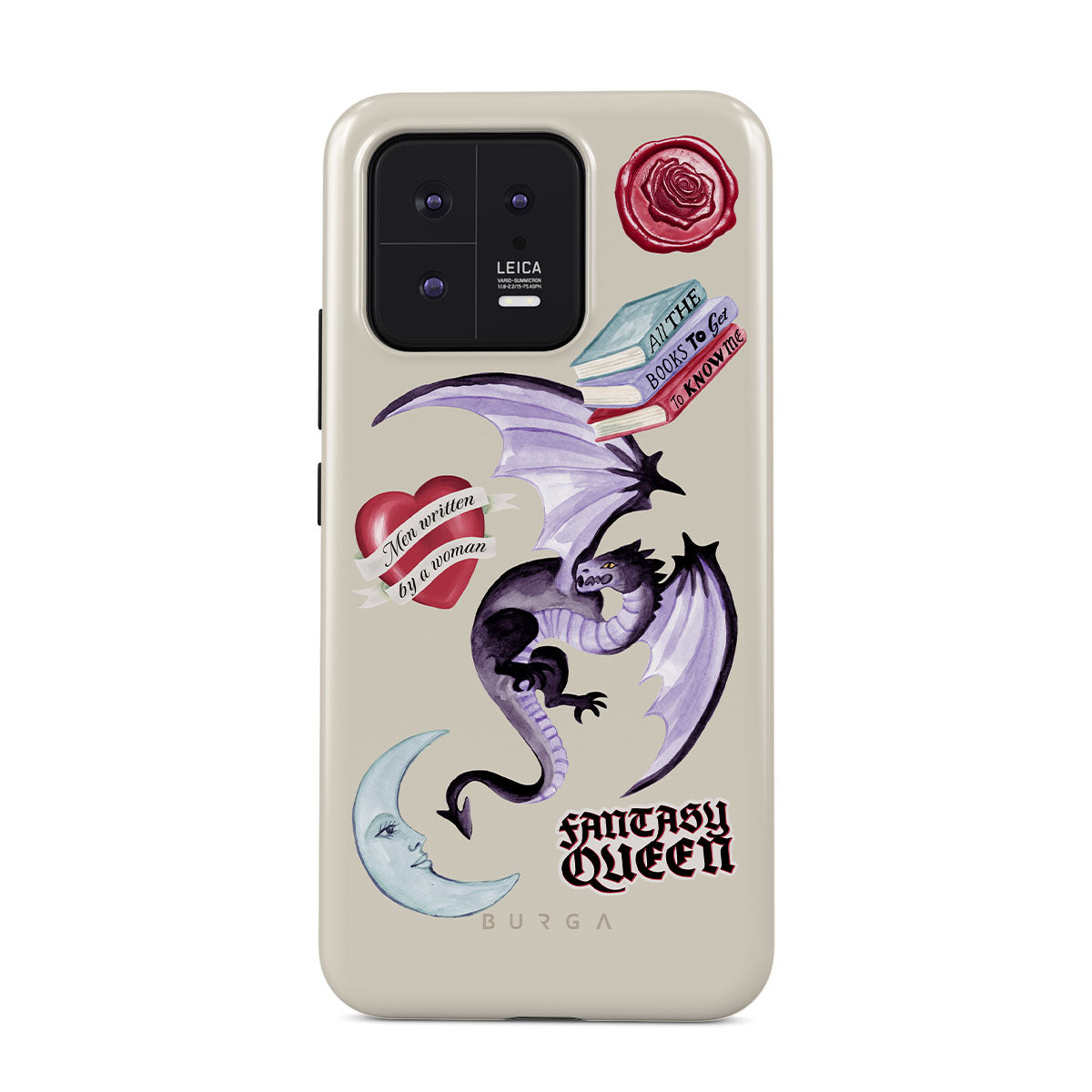 En este diseño: dragón morado, sticker "Fantasy Queen", luna creciente, sello de cera morado, corazón con mensaje, libros.
