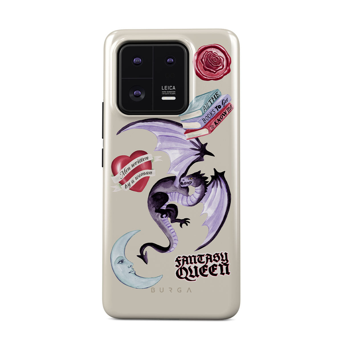 En este diseño: dragón morado, sticker "Fantasy Queen", luna creciente, sello de cera morado, corazón con mensaje, libros.