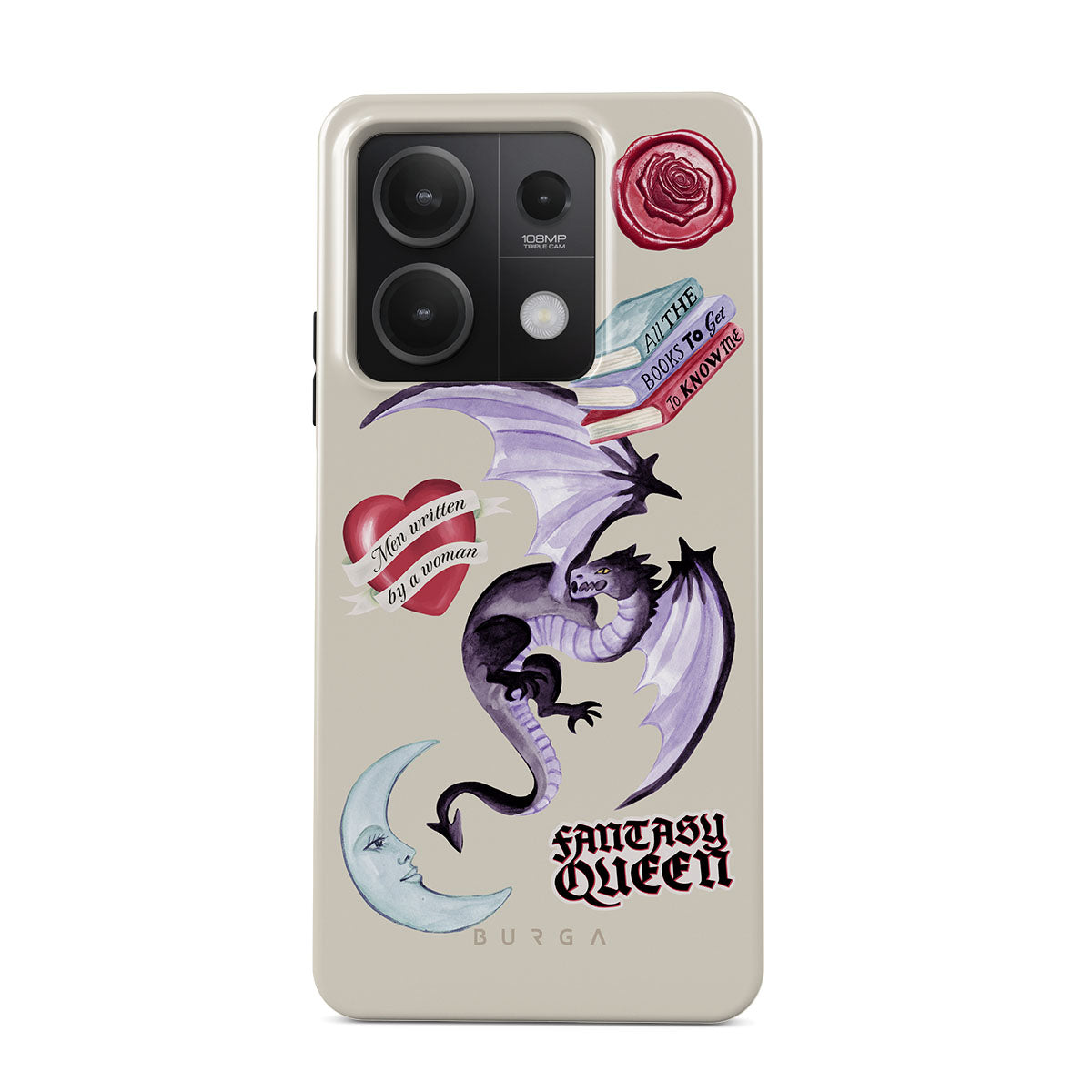 En este diseño: dragón morado, sticker "Fantasy Queen", luna creciente, sello de cera morado, corazón con mensaje, libros.