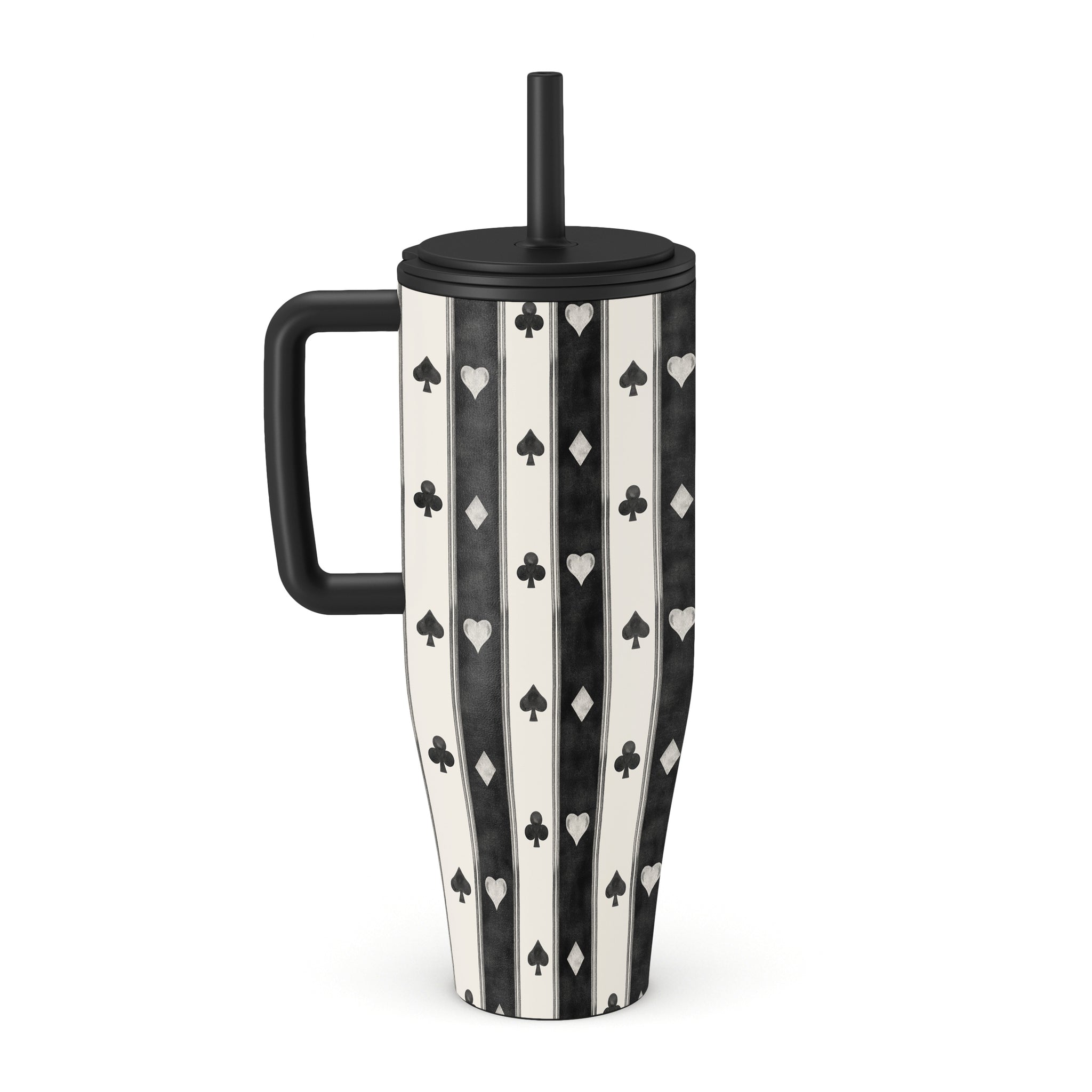 En este diseño: rayas en blanco y negro, corazones, palos de cartas, estilo vintage