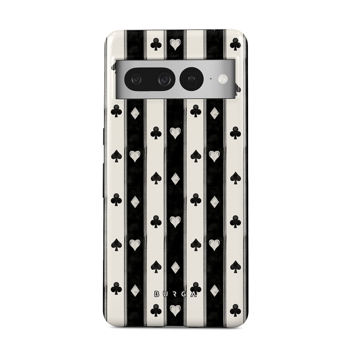 En este diseño: rayas en blanco y negro, corazones, palos de cartas, estilo vintage.