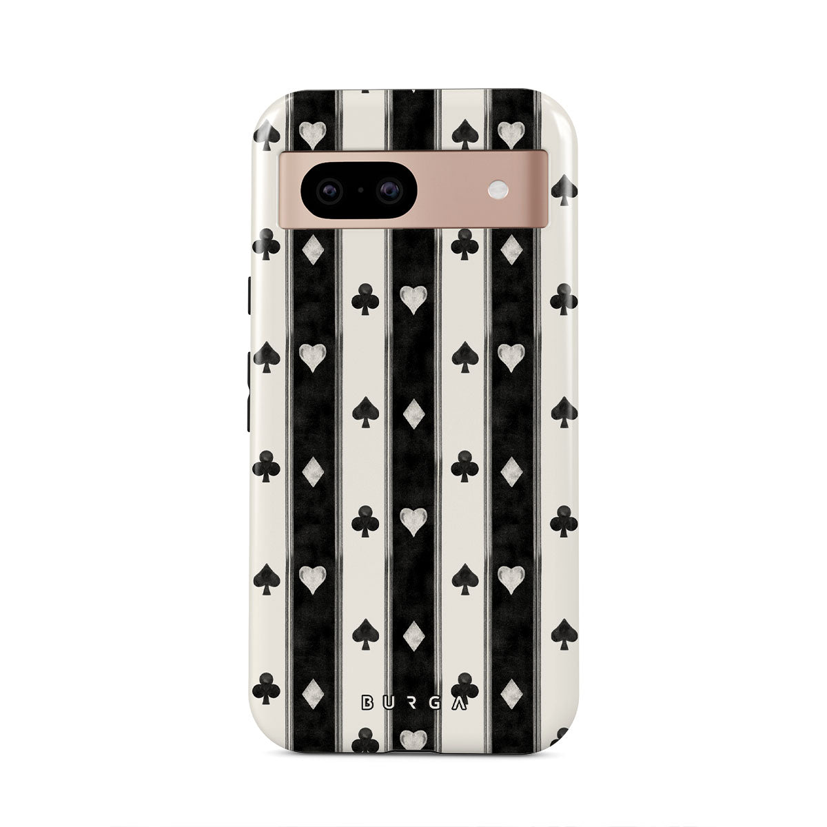 En este diseño: rayas en blanco y negro, corazones, palos de cartas, estilo vintage.