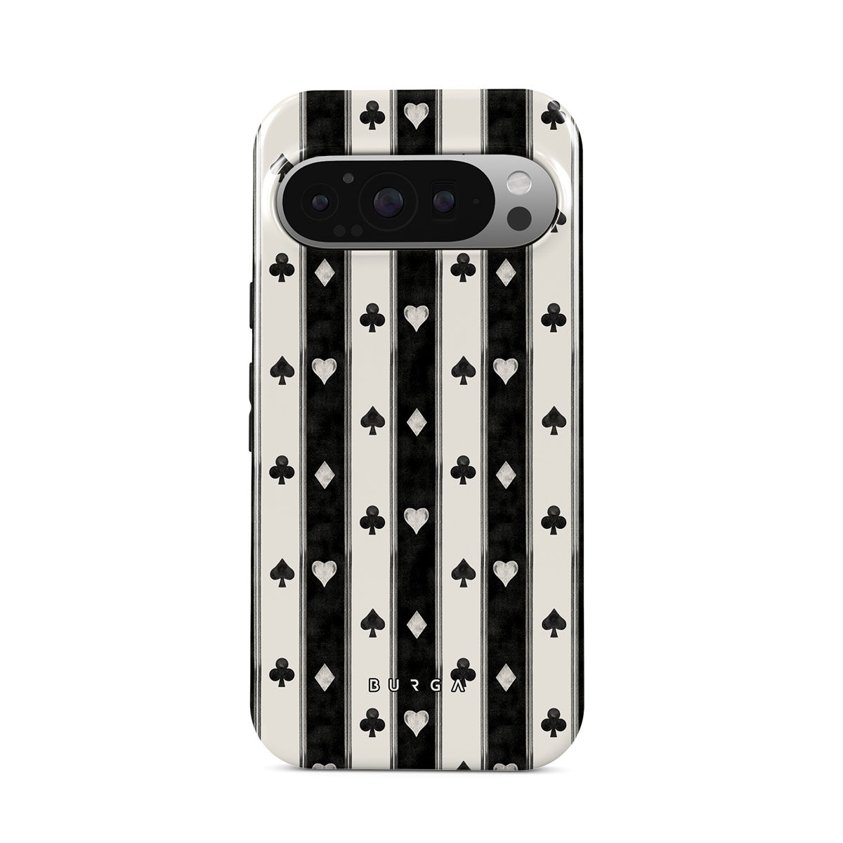 En este diseño: rayas en blanco y negro, corazones, palos de cartas, estilo vintage.