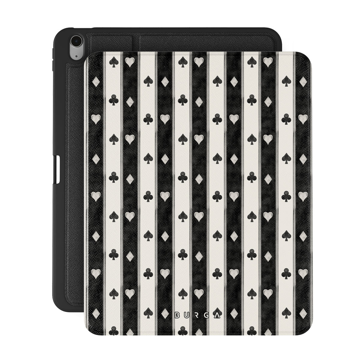 En este diseño: rayas en blanco y negro, corazones, palos de cartas, estilo vintage.