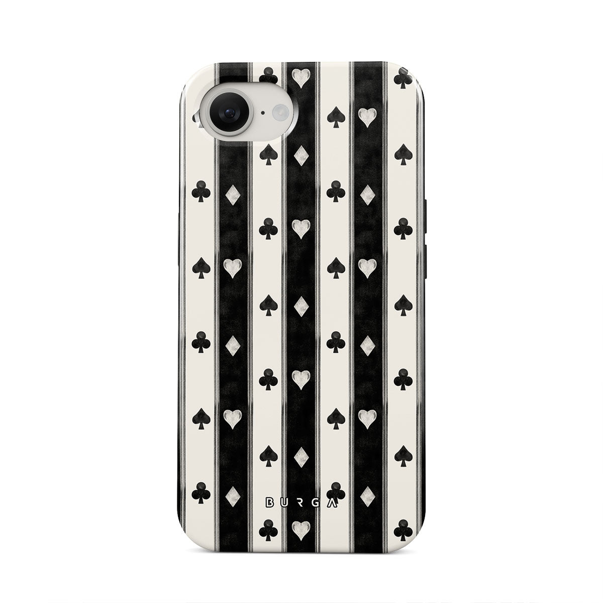 En este diseño: rayas en blanco y negro, corazones, palos de cartas, estilo vintage.