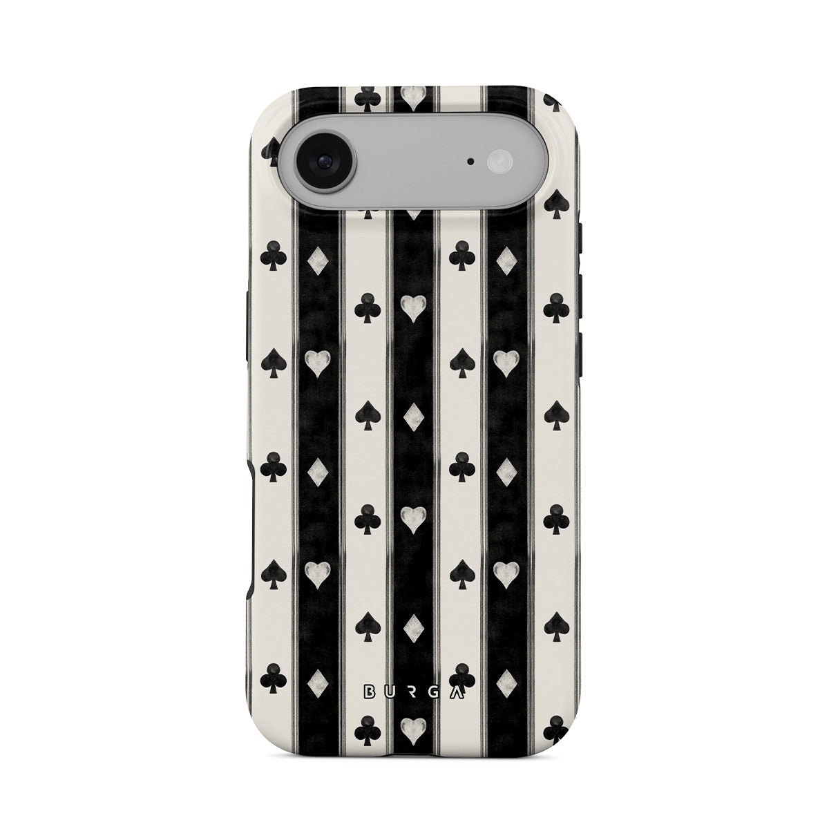 En este diseño: rayas en blanco y negro, corazones, palos de cartas, estilo vintage.