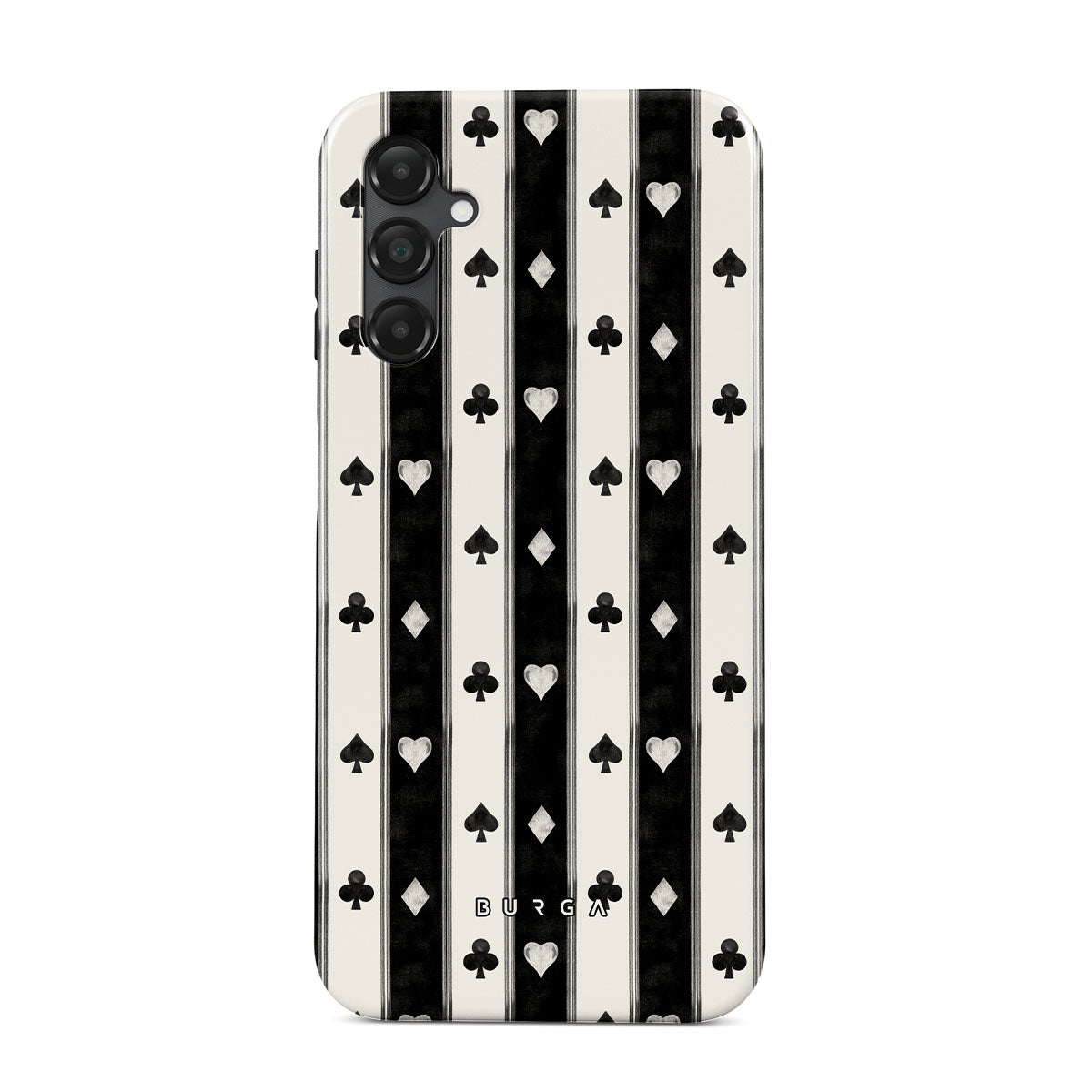 En este diseño: rayas en blanco y negro, corazones, palos de cartas, estilo vintage.
