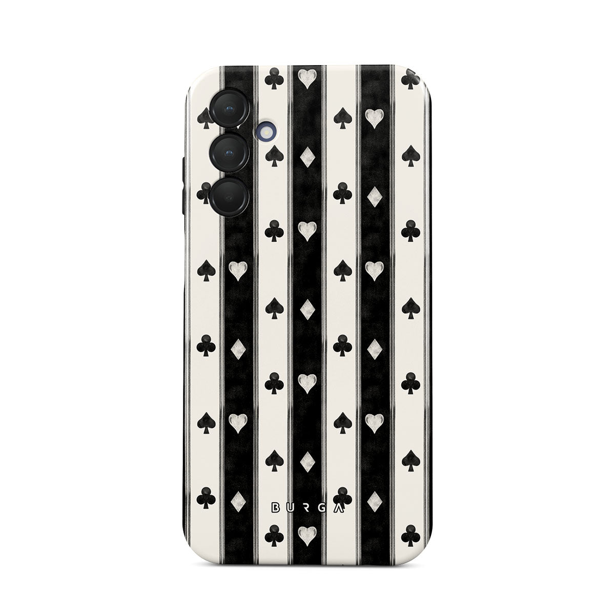 En este diseño: rayas en blanco y negro, corazones, palos de cartas, estilo vintage.
