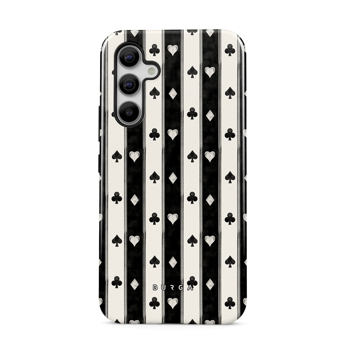 En este diseño: rayas en blanco y negro, corazones, palos de cartas, estilo vintage.