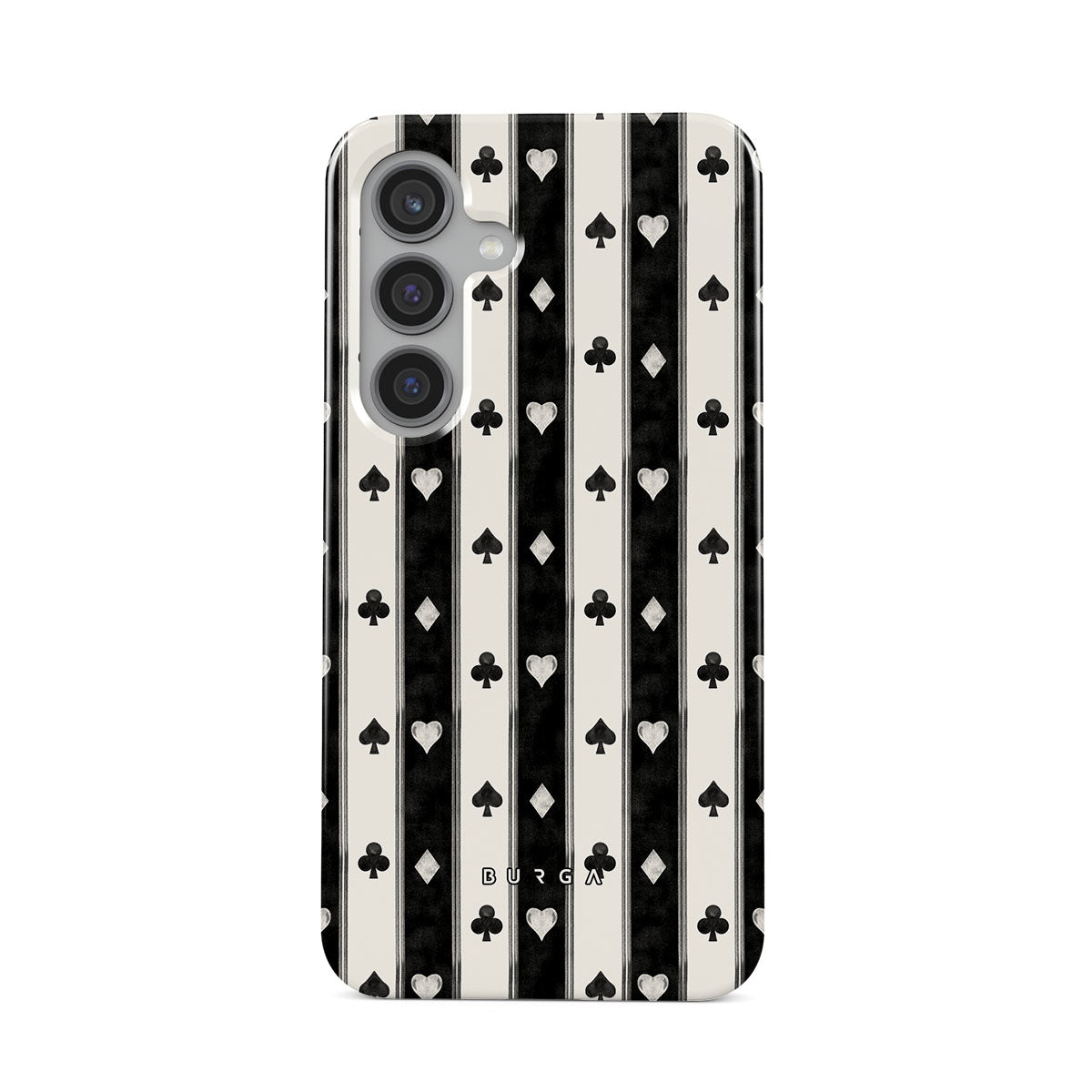 En este diseño: rayas en blanco y negro, corazones, palos de cartas, estilo vintage.