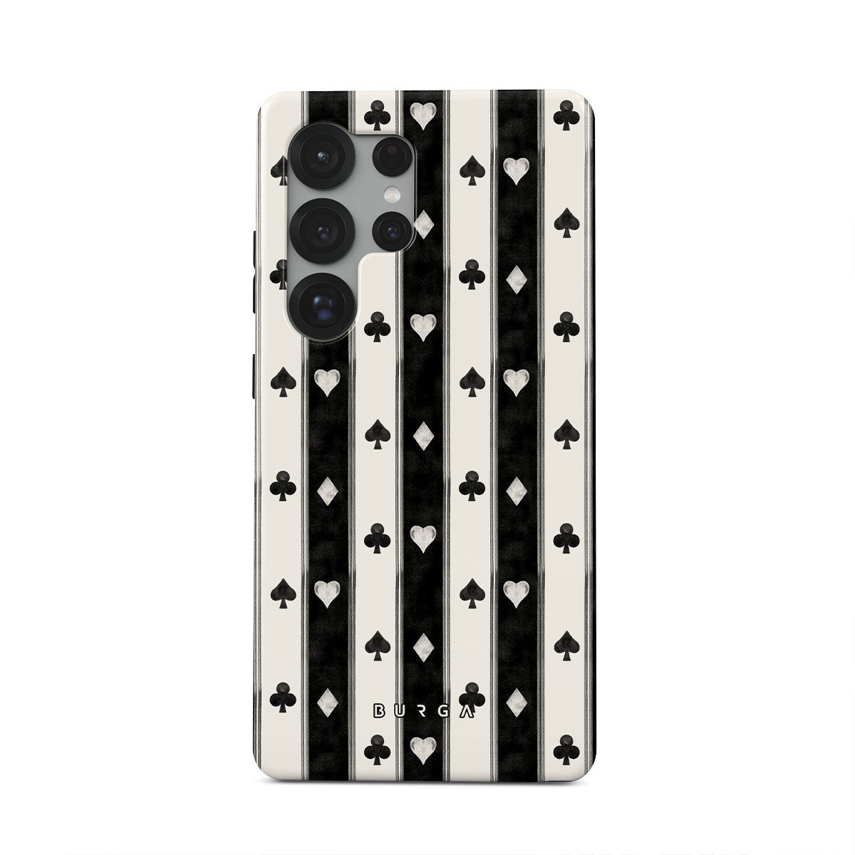 En este diseño: rayas en blanco y negro, corazones, palos de cartas, estilo vintage.