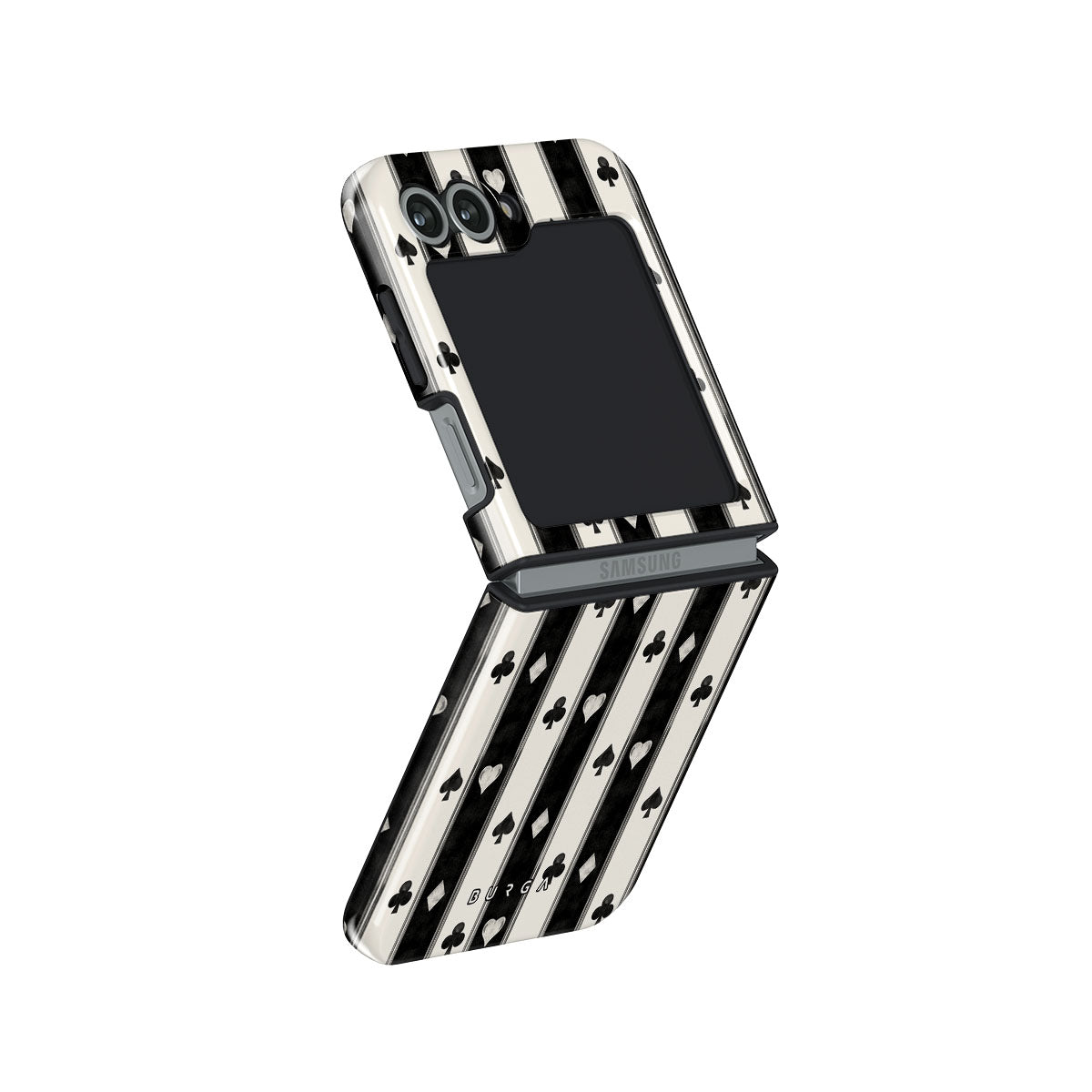 En este diseño: rayas en blanco y negro, corazones, palos de cartas, estilo vintage.