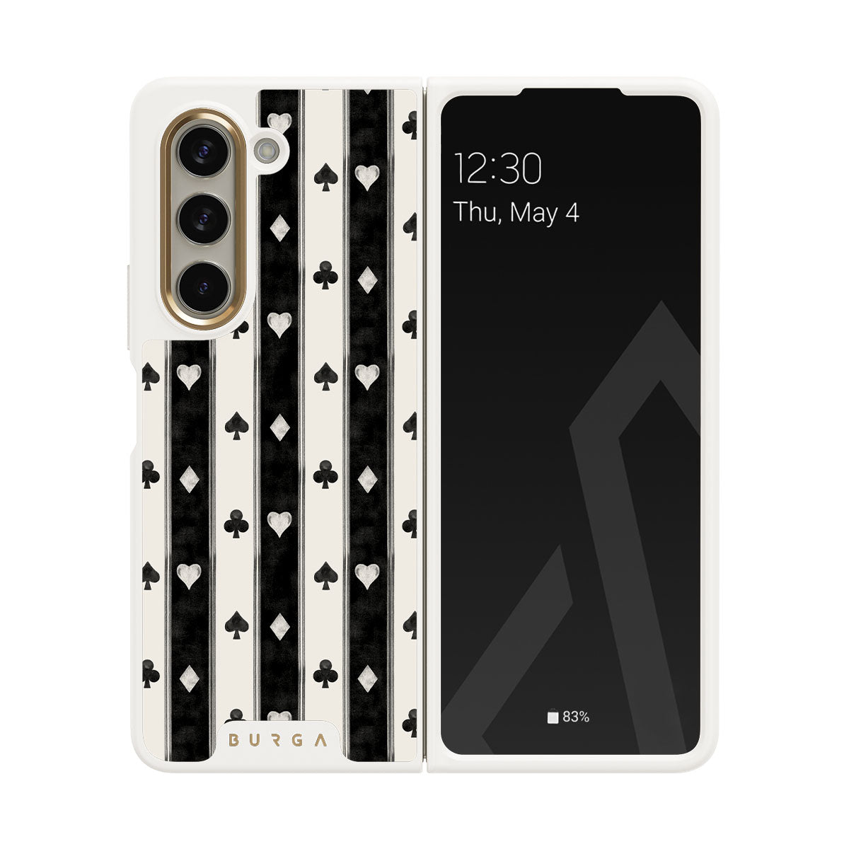 En este diseño: rayas en blanco y negro, corazones, palos de cartas, estilo vintage.