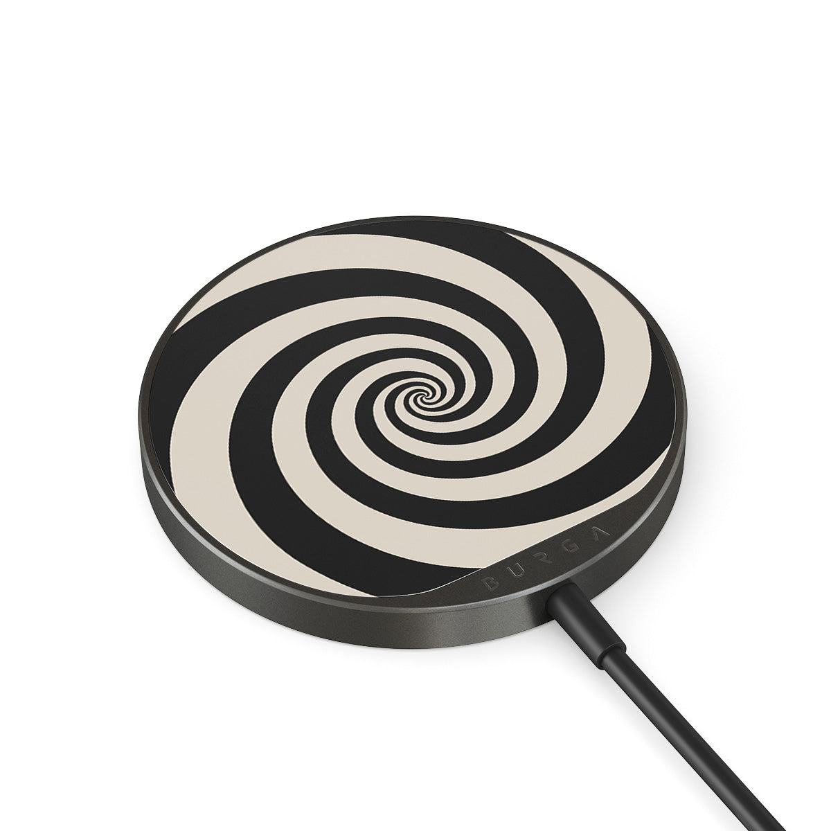 En este diseño: espiral blanco y negro, patrón hipnótico