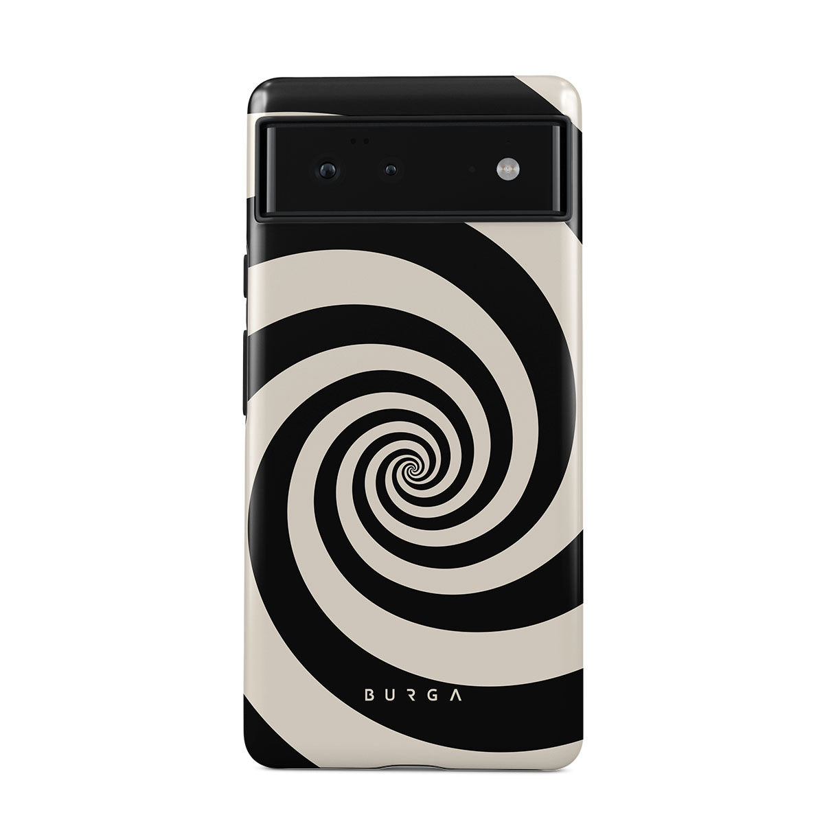 En este diseño: espiral blanco y negro, patrón hipnótico.