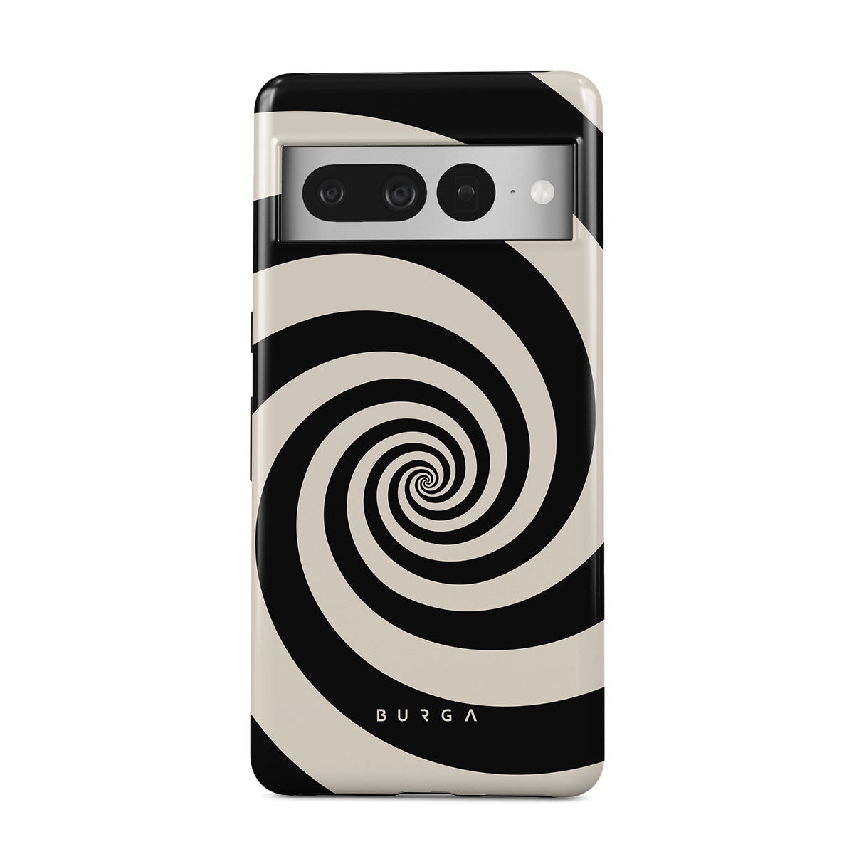 En este diseño: espiral blanco y negro, patrón hipnótico.
