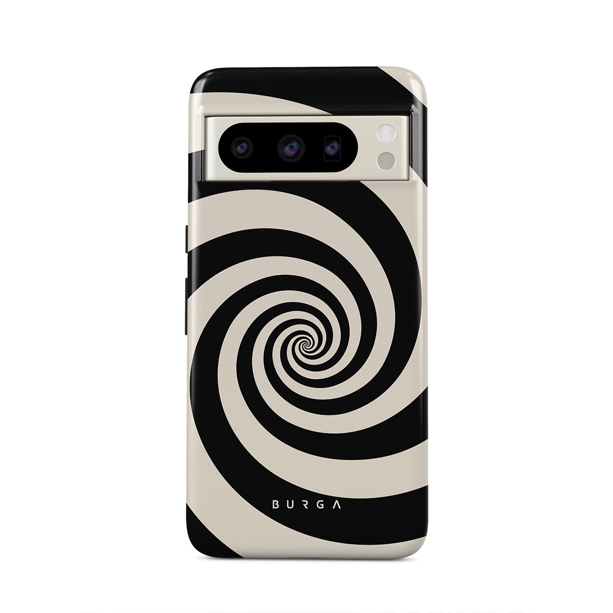 En este diseño: espiral blanco y negro, patrón hipnótico.