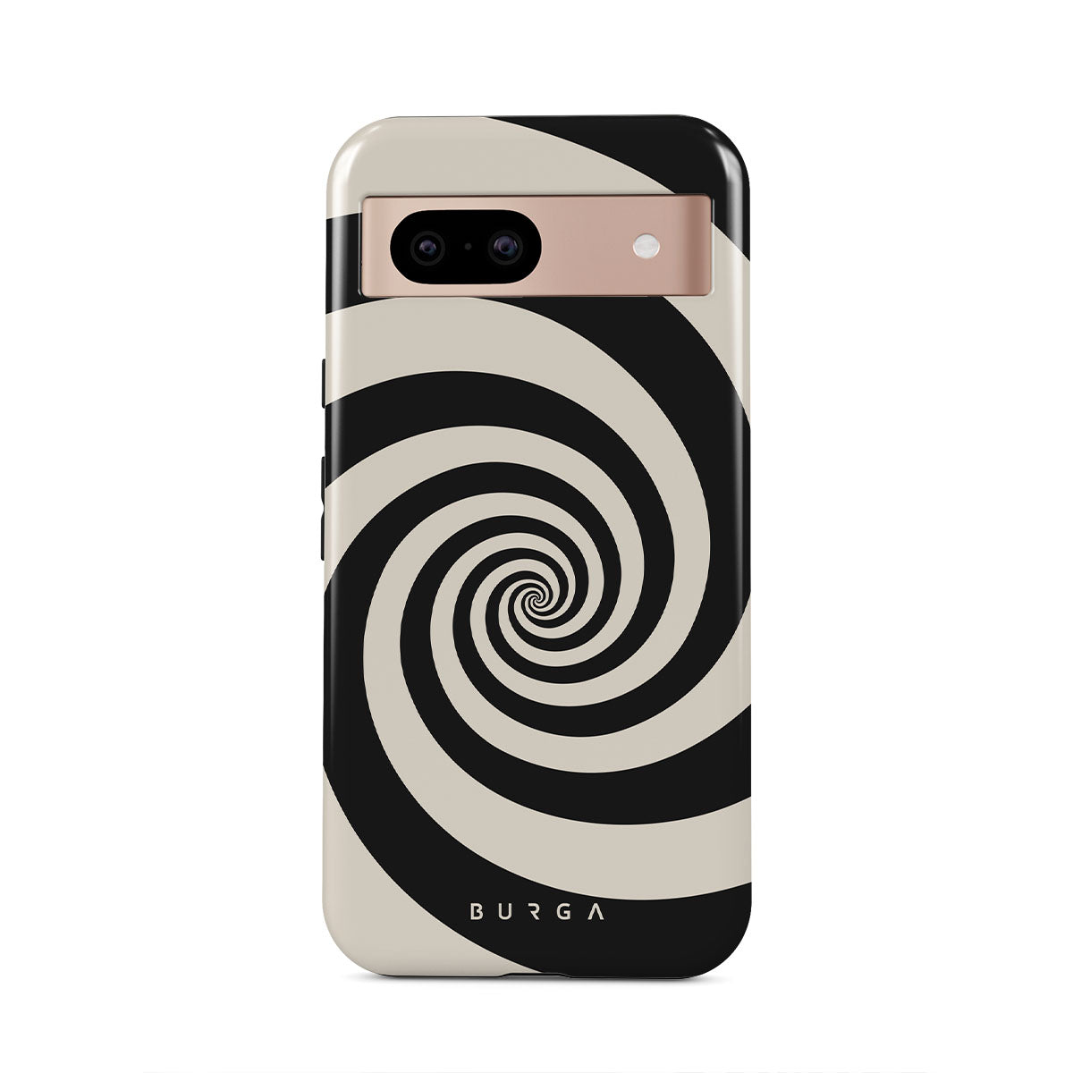 En este diseño: espiral blanco y negro, patrón hipnótico.