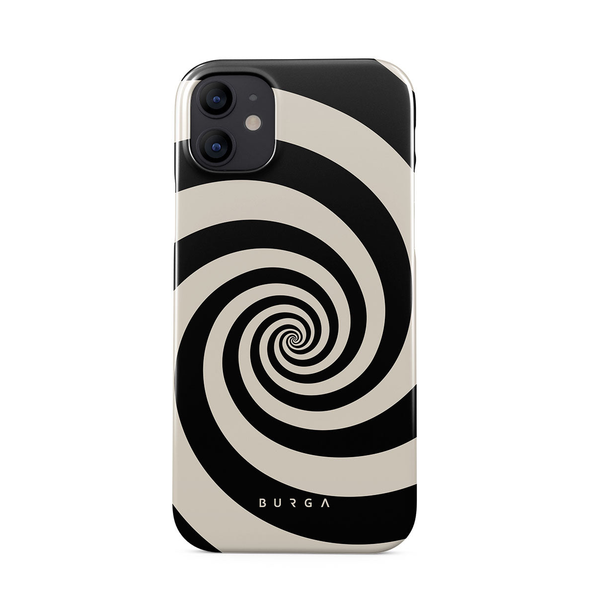 En este diseño: espiral blanco y negro, patrón hipnótico.