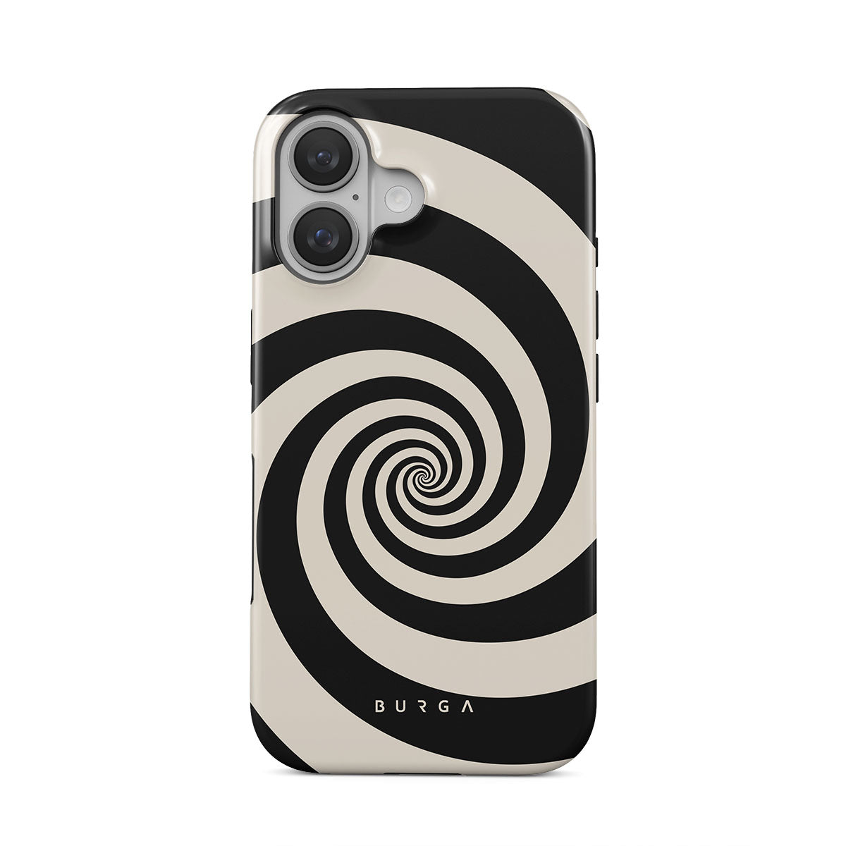 En este diseño: espiral blanco y negro, patrón hipnótico.