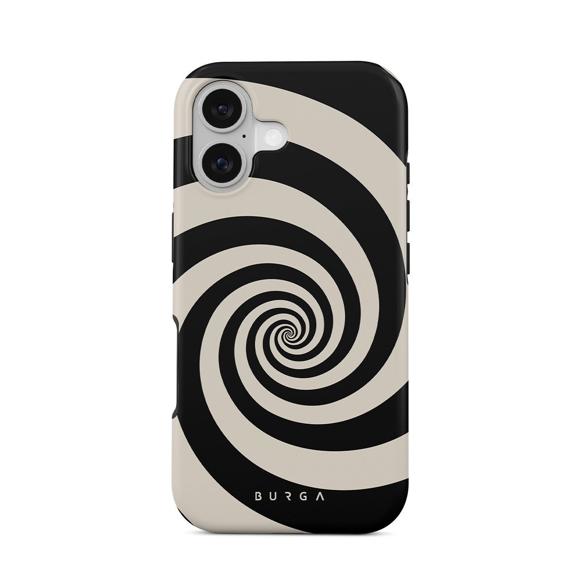 En este diseño: espiral blanco y negro, patrón hipnótico.