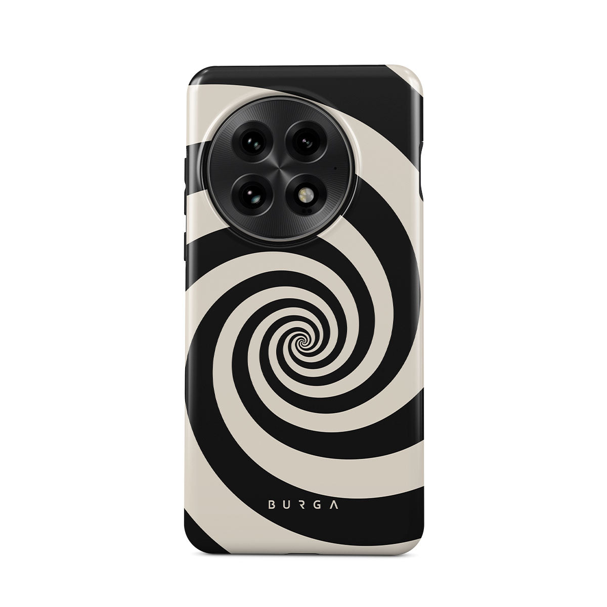 En este diseño: espiral blanco y negro, patrón hipnótico.