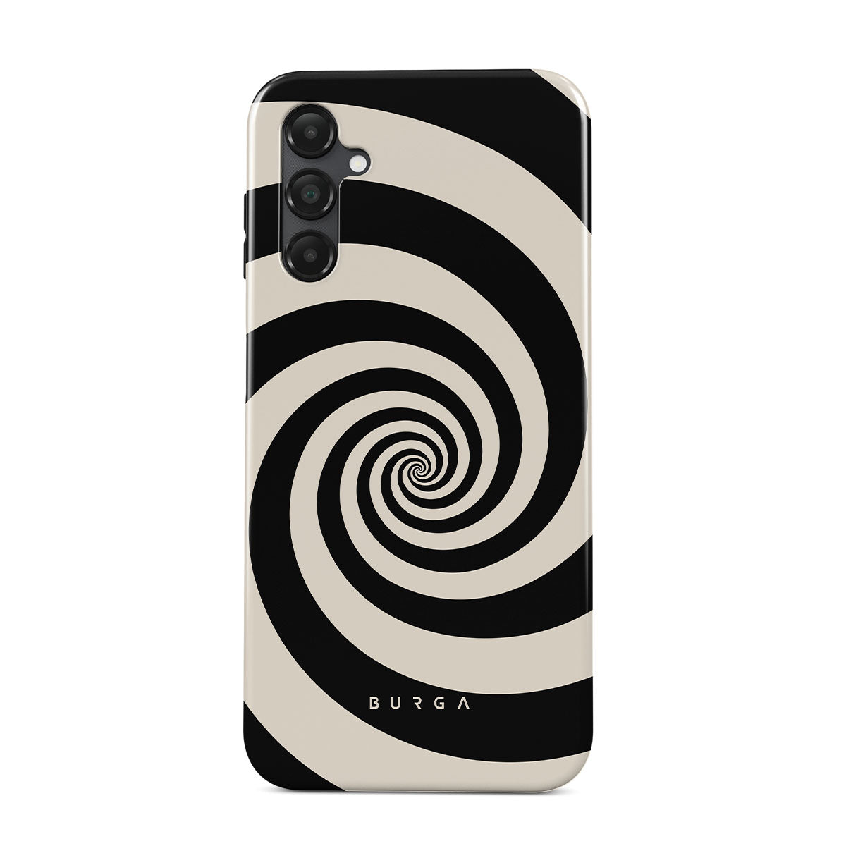 En este diseño: espiral blanco y negro, patrón hipnótico.