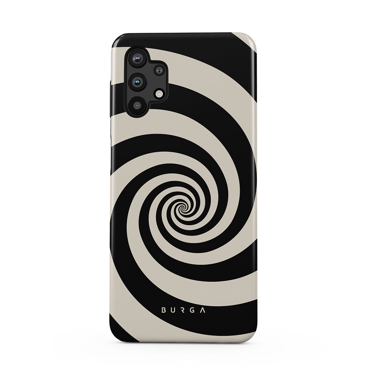En este diseño: espiral blanco y negro, patrón hipnótico.